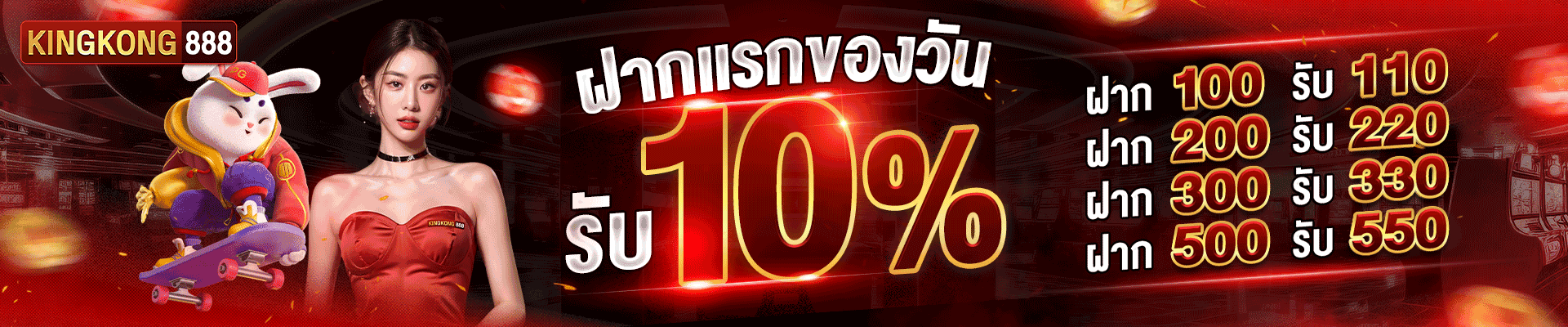 เริ่มต้นสำหรับสมาชิกใหม่ที่เพิ่งสมัครเข้ามา KingKong888 มอบโบนัสต้อนรับสูงถึง 100% สูงสุด 10,000 บาท เพียงแค่ฝากเงินครั้งแรกเข้ามา ก็รับโบนัสไปเลยทันที นอกจากนี้ยังมีโปรโมชั่นเติมเงินครั้งแรกของวันรับเพิ่มอีก 20% ทุกวัน ทำให้มีทุนในการเล่นเพิ่มขึ้นอย่างต่อเนื่อง